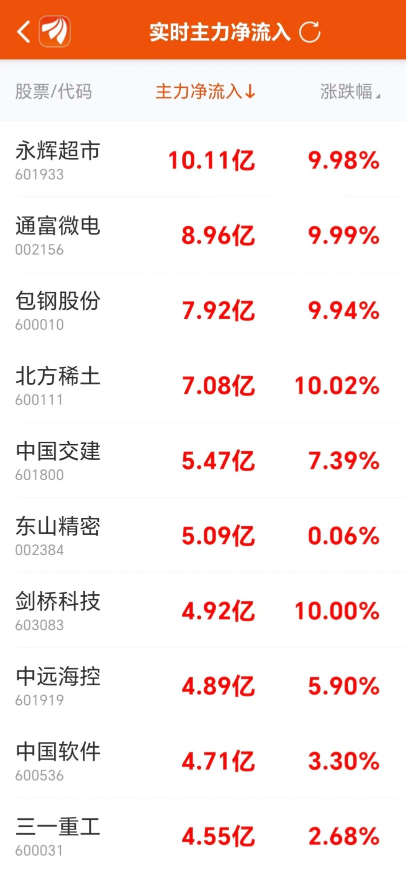 东方财富Choice数据显示,11月1日主力净买入前10大个股中,永辉超市排名第一,主力净买入10.11亿元,该股当日涨停;通富微电排名第二,主力净买入8.96亿元,该股当日涨停。