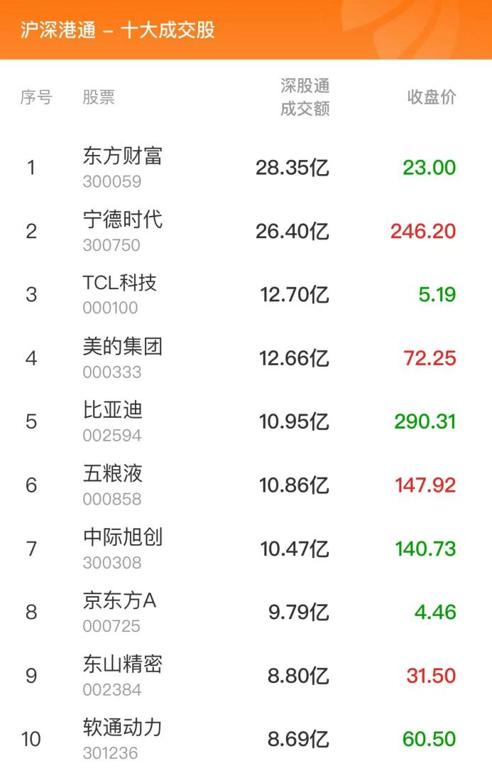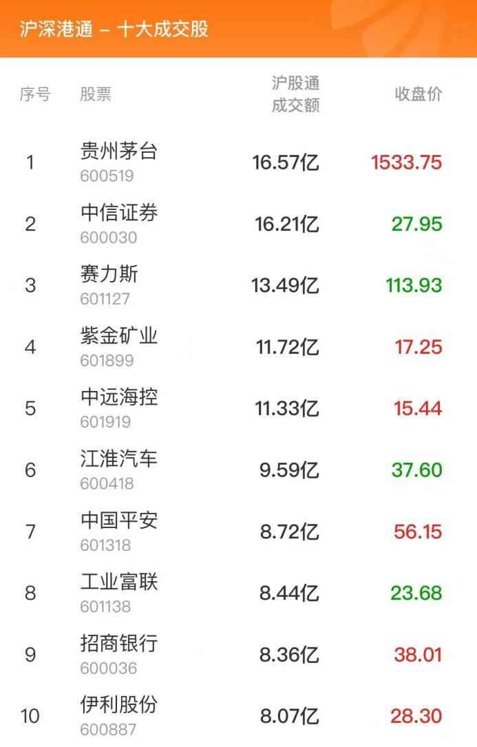 交易所公布的当日沪深港通十大成交股显示,贵州茅台、中信证券(维权)、赛力斯位列沪股通前三,成交额分别为16.57亿元、16.21亿元、13.49亿元;东方财富、宁德时代、TCL科技位列深股通前三,成交额分别为28.35亿元、26.40亿元、12.70亿元。