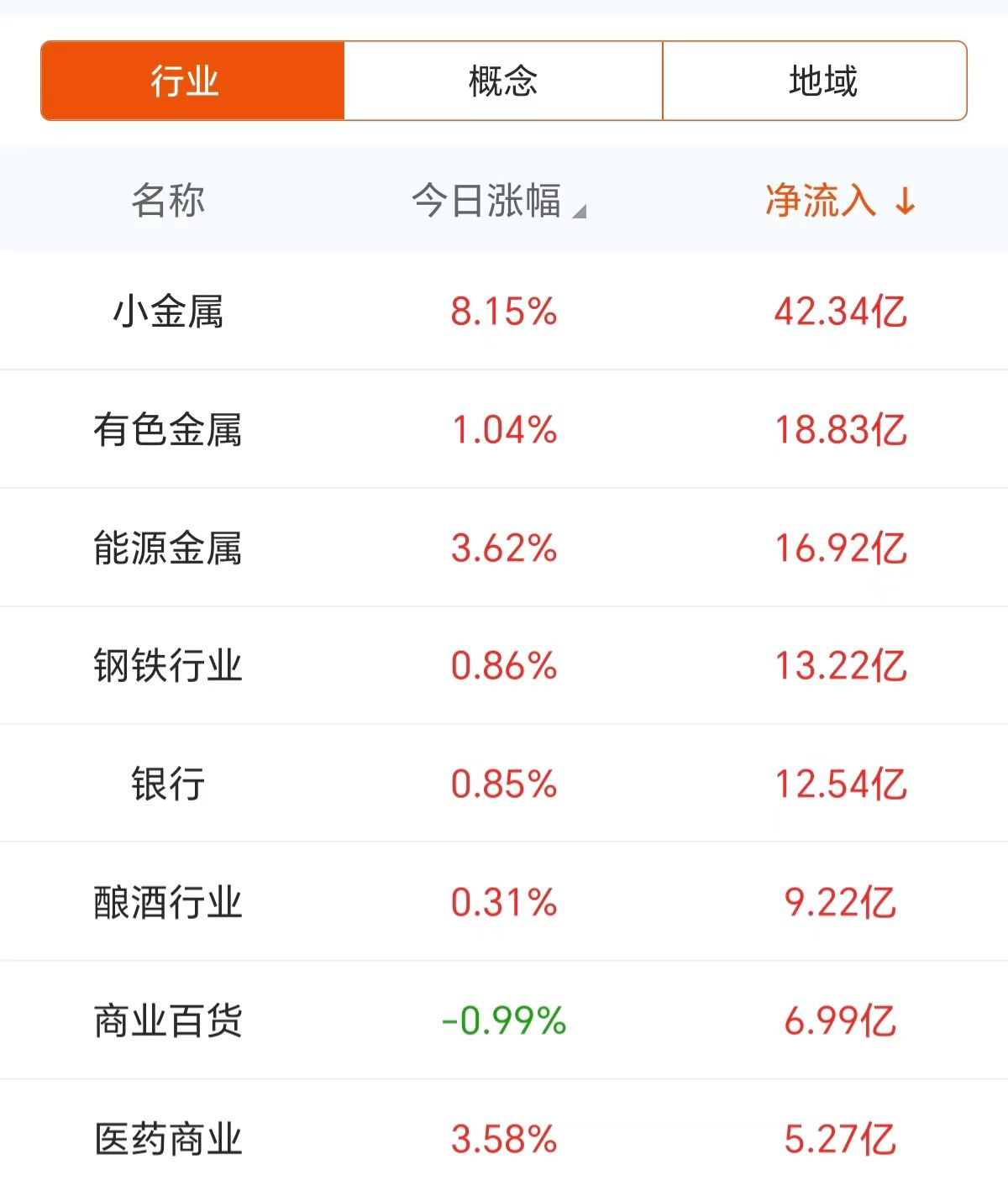 周五小金属、有色金属净流入,其中小金属净流入42.34亿元。
