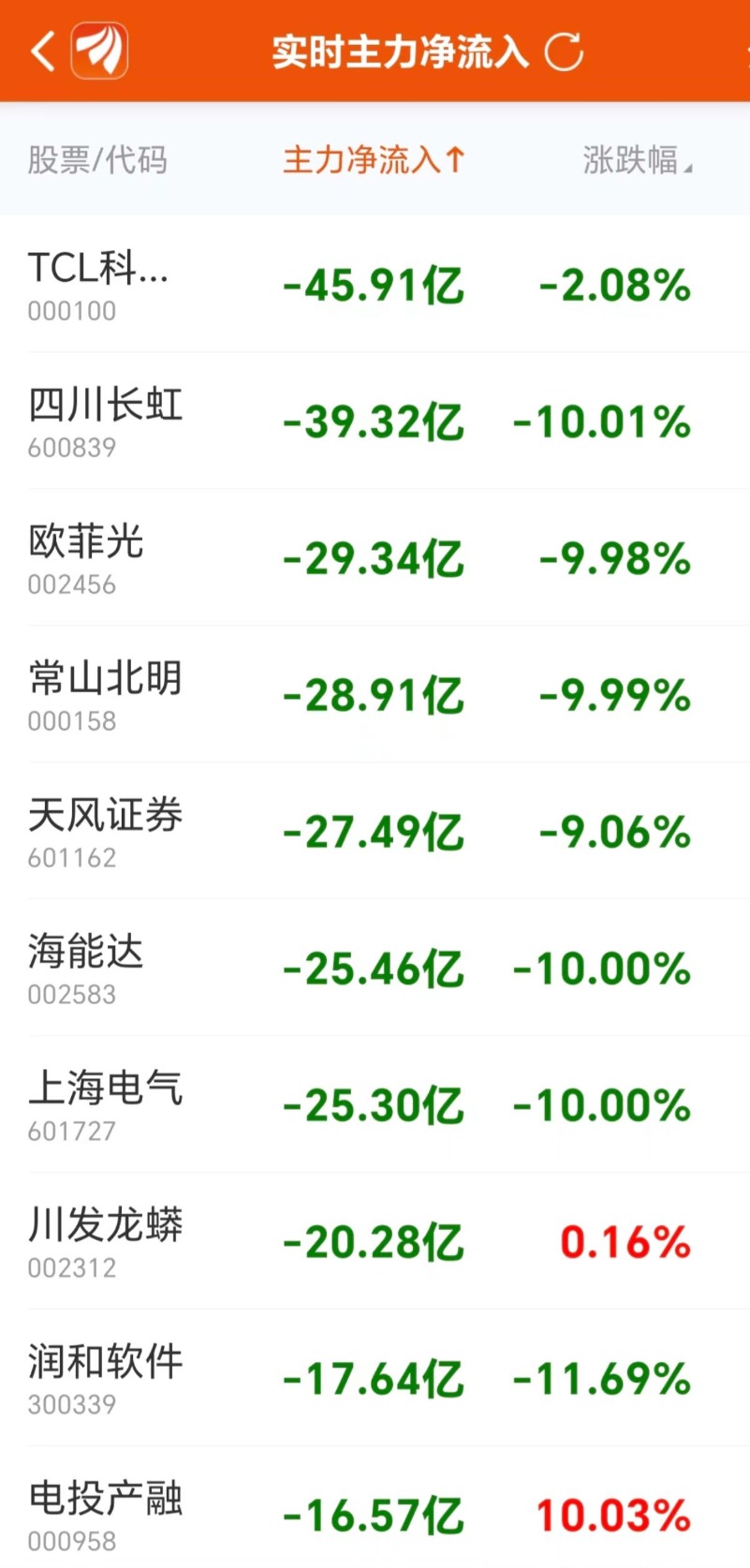 东方财富Choice数据显示,11月1日主力净卖出前10大个股中,TCL科技排名第一,主力净卖出45.91亿元;四川长虹排名第二,主力净卖出39.32亿元。