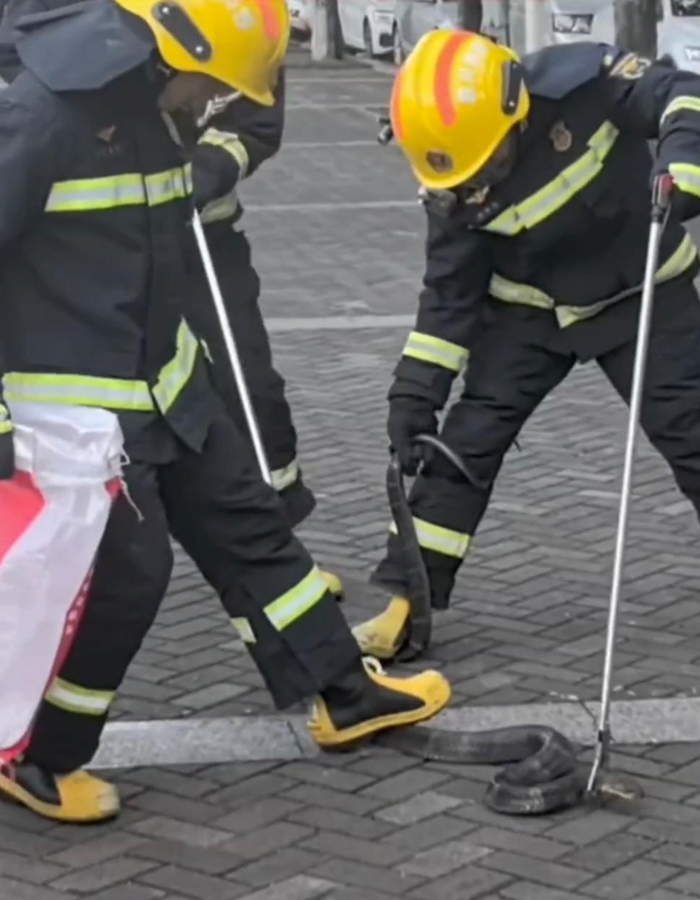 29日下午,会东县消防救援大队接到群众报警称鲹鱼水乡的街道上出现眼镜王蛇。消防人员抵达现场后,队员们穿戴好防护头盔、防护服与防护手套,做好全方位防护。最后,消防人员手持捕蛇夹,缓缓靠近目标,夹住蛇身关键部位,成功将其捕捉。
