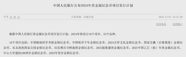央行官网公示的2024年普通纪念币与贵金属纪念币发行计划