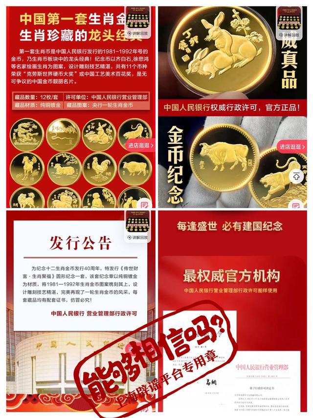 “为纪念十二生肖金币发行40周年,特发行《传世财富·生肖聚福》圆形纪念一套”“一次性收齐央行十二生肖纪念币”“中国第一套生肖金币,生肖珍藏的龙头经典”……金光闪闪的硬币,配合如此宣传,有的甚至带有“央行发行公告”等“红头文件”,是不是可信度很高?