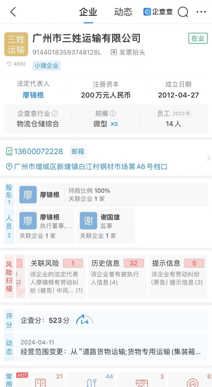 记者从企查查上了解到,该公司属于微型企业公司,员工共有14人,主要负责道路货物运输、货物专用运输等。