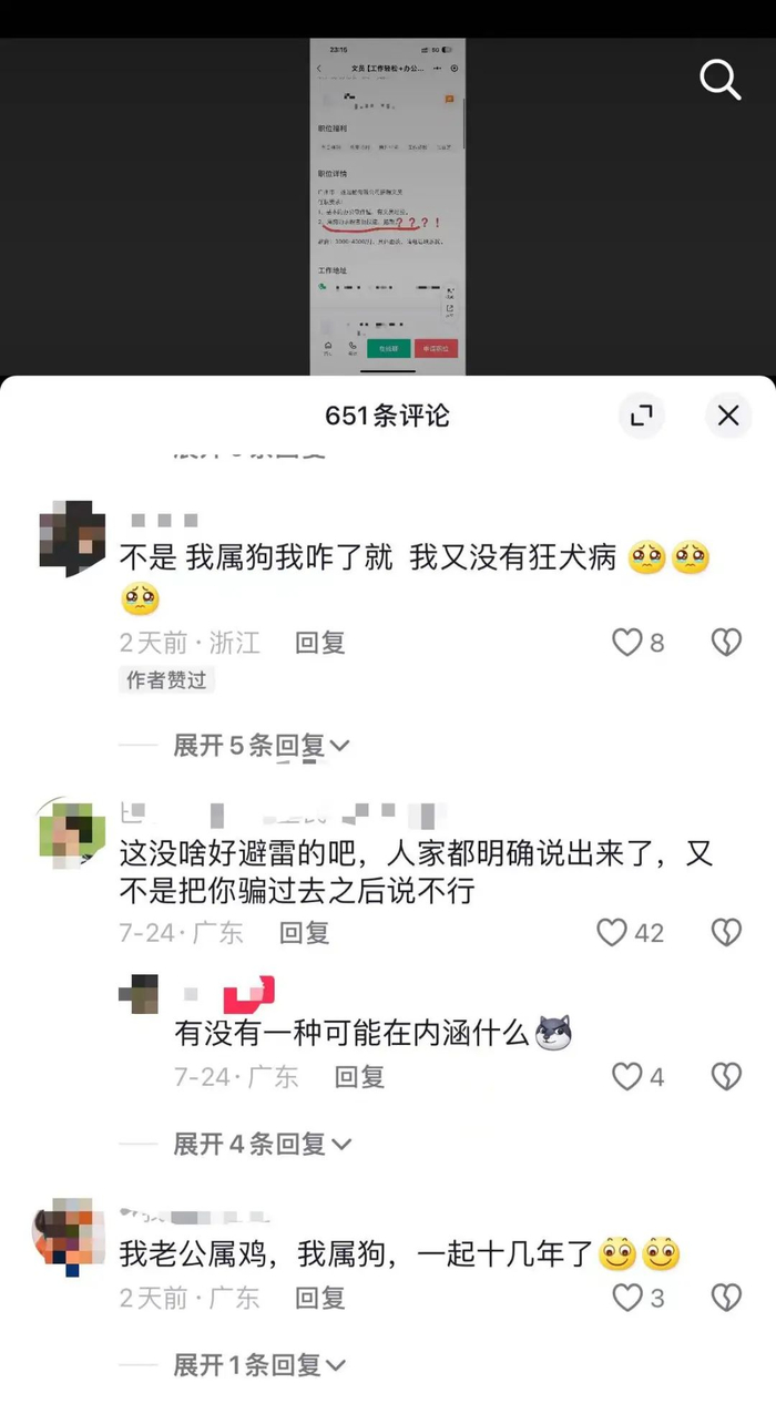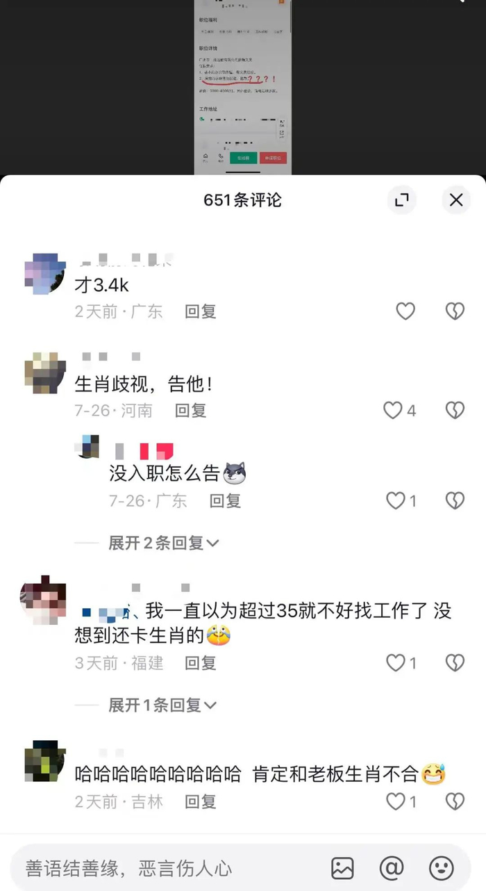 “不是 我属狗咋了就 我又没有狂犬病。”“生肖歧视,告他。”“我一直以为超过35岁不好找工作了,没想到还卡生肖。”“人家都明确说出来了,又不是把你骗过去之后说不行。”