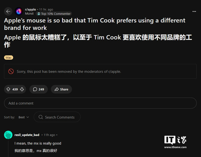 然而,《The Mac Observer》误解了《The Verge》的文章,发布了一篇现已删除的文章,文章声称库克更喜欢 MX Master 3 而非妙控鼠标。虽然错误在所难免,但这一错误信息在 Reddit 上多次被传播,因此有必要澄清事实,防止错误信息的进一步扩散。